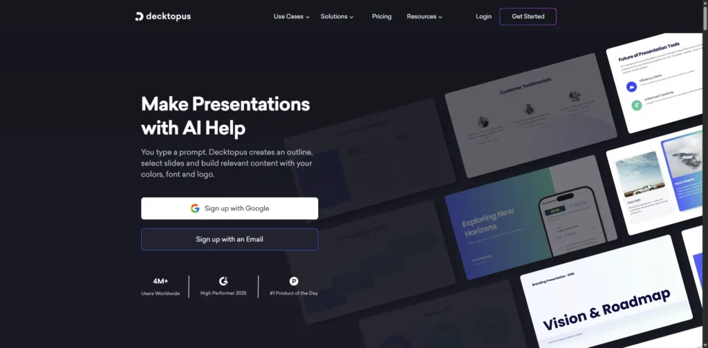 Decktopus is a guided, prompt-based AI presentation builder. It asks you a series of questions about your topic, audience, and goal, then generates a structured, professional business deck complete with speaker notes and suggested visuals.