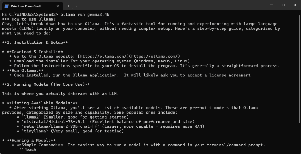 Ollama provides a runtime that loads the model into memory and exposes interfaces for interactive use and programmatic calls. This can be used as a local REST API or via the CLI.
